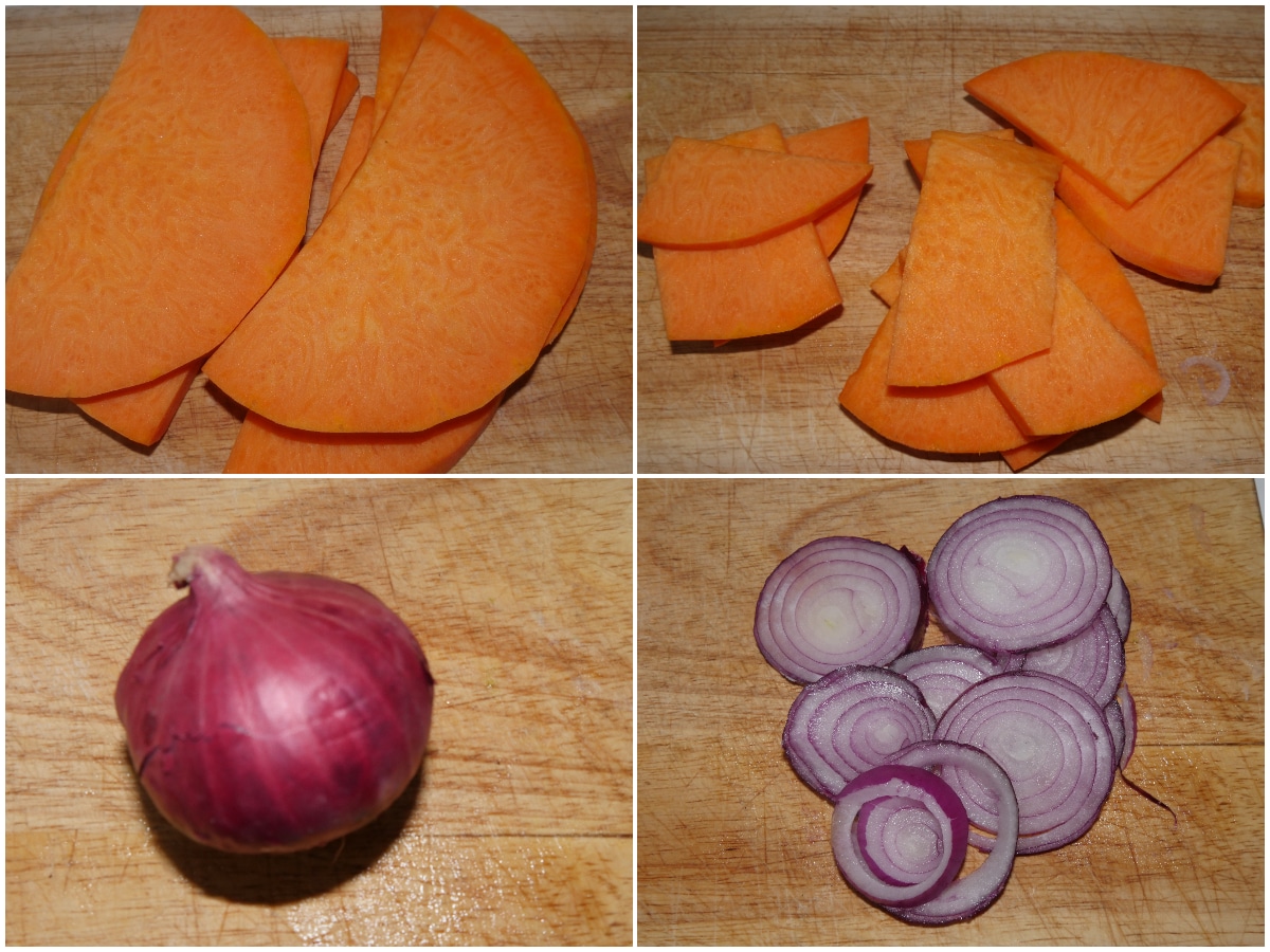 Nel frattempo tagliate la zucca a fettine sottili e la cipolla a rondelle.