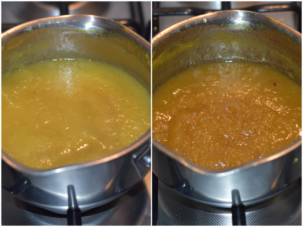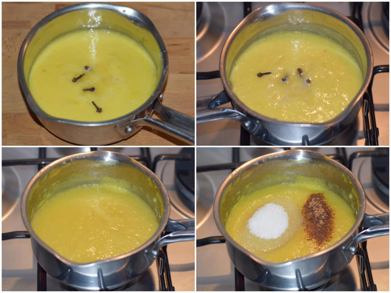 Frullatela (con un minipimer o un mixer), mettetela in un pentolino con i chiodi di garofano e il succo di limone e cuocete per circa 20 minuti a fuoco lento, quindi unite anche zucchero e cannella.