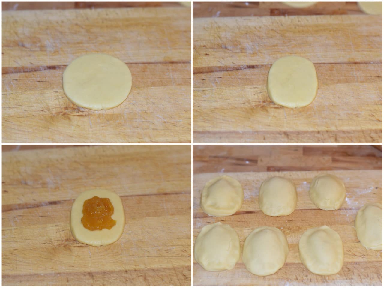 Prendete 1 disco per volta, farcitelo con un po' di ripieno (la marmellata di ananas, ormai fredda), coprite con un secondo disco e sigillate i bordi, continuando poi a formare gli altri biscotti nello stesso modo.