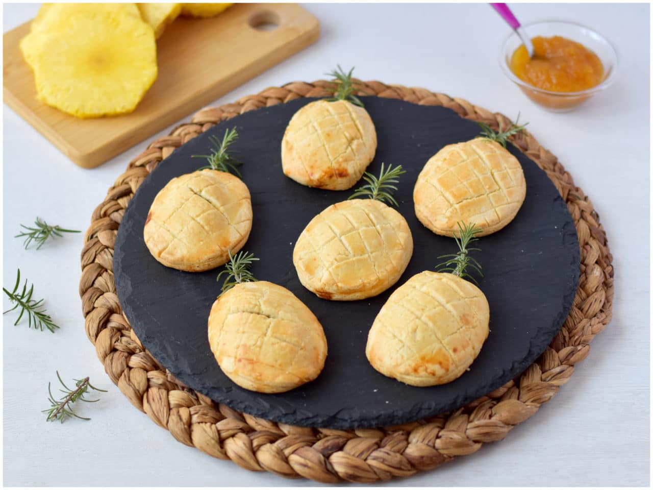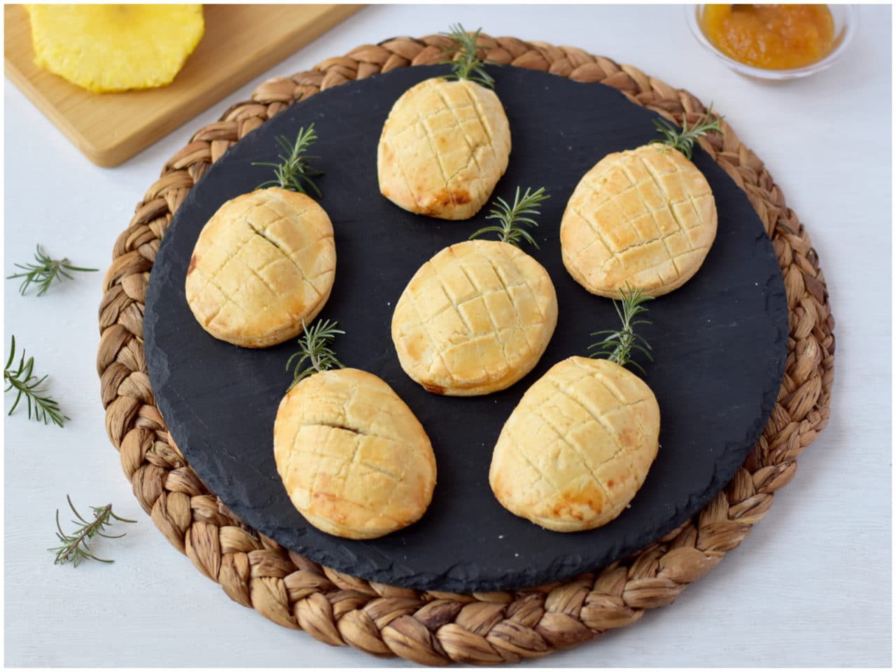 Una volta pronti lasciate intiepidire leggermente i biscotti, quindi con uno stuzzicadenti create un forellino a una delle due estremità, proprio tra i 2 strati di frolla, e usatelo per infilarci dentro una cimetta di rosmarino, che simulerà il ciuffo dell'ananas.