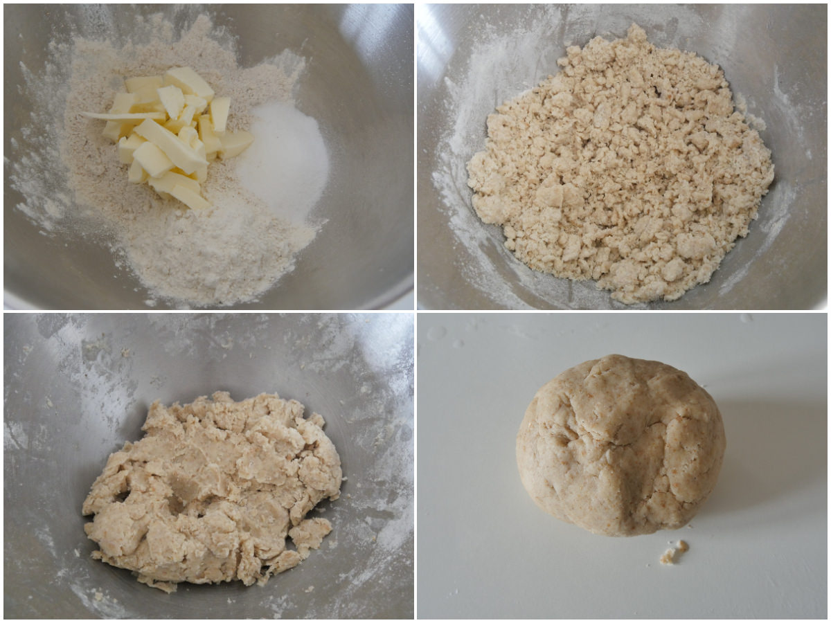 Mettete farine, zucchero e sale a fontana in una ciotola, aggiungete al centro il burro e iniziate a impastare con la punta delle dita, fino ad ottenere un composto sbricioloso, quindi aggiungete l'acqua, possibilmente fredda di frigo, e lavorate velocemente fino ad ottenere un panetto omogeneo.