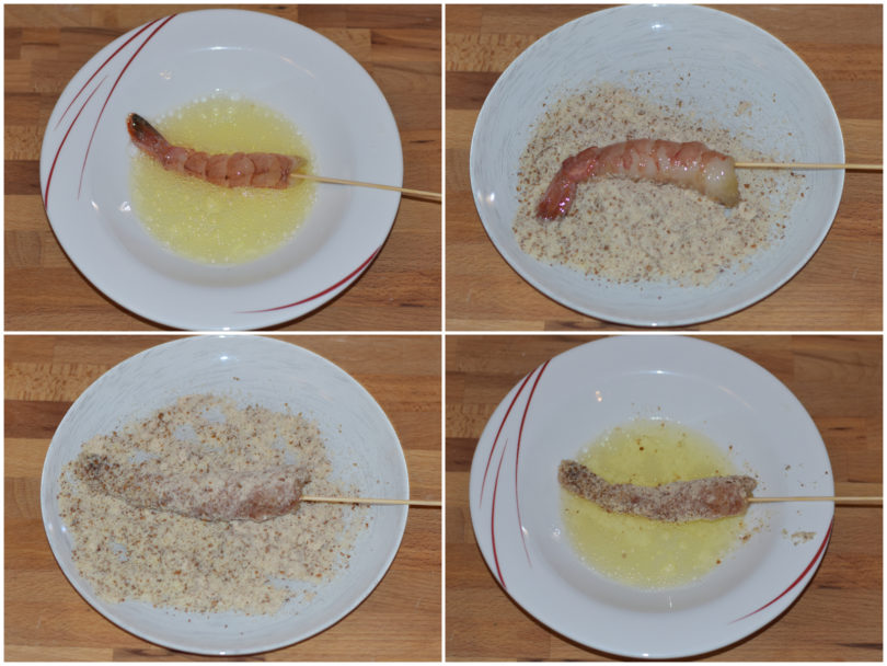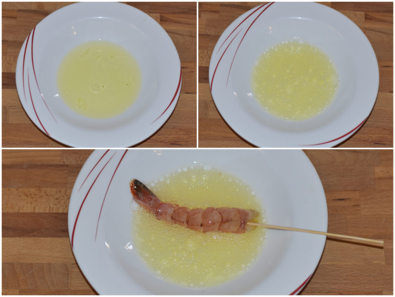 Infilzate i gamberi in uno spiedino, sbattete leggermente gli albumi e passateci dentro i gamberi.