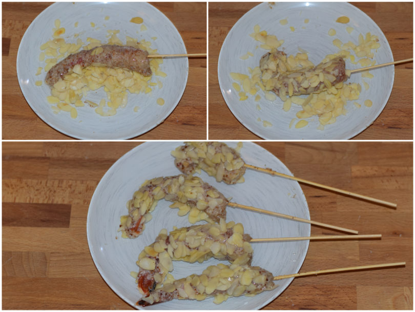 Passate i gamberi nella farina di mandorle, poi di nuovo negli albumi e infine nelle lamelle di mandorle, cercando ogni volta di ricoprirli in maniera uniforme.