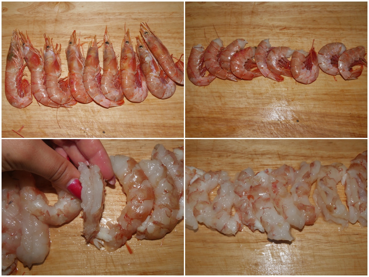 Innanzitutto pulite i gamberi (qui la guida per farlo al meglio), eliminando teste, code e carapaci.