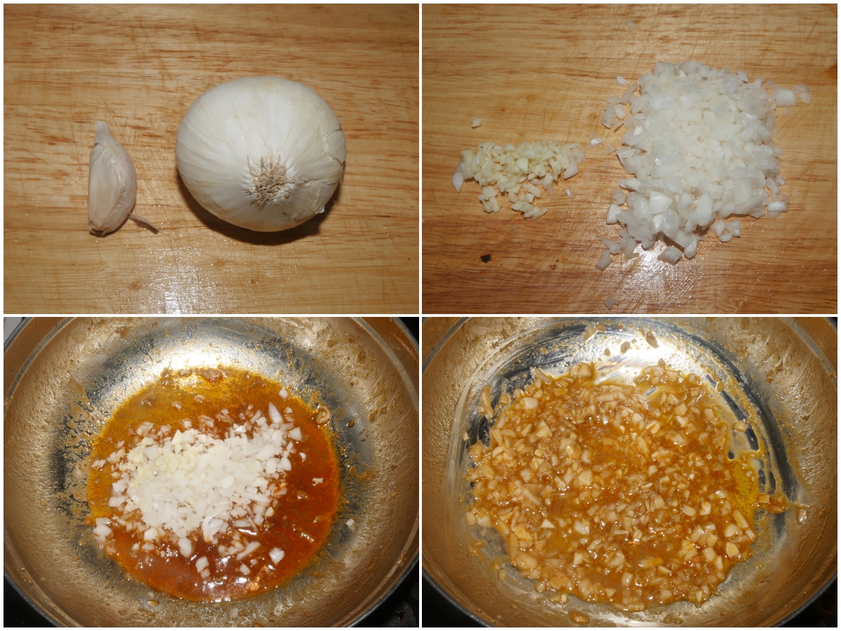 Mondate e tritate finemente aglio e cipolla e uniteli al fondo di cottura, quindi lasciateli soffriggere brevemente.