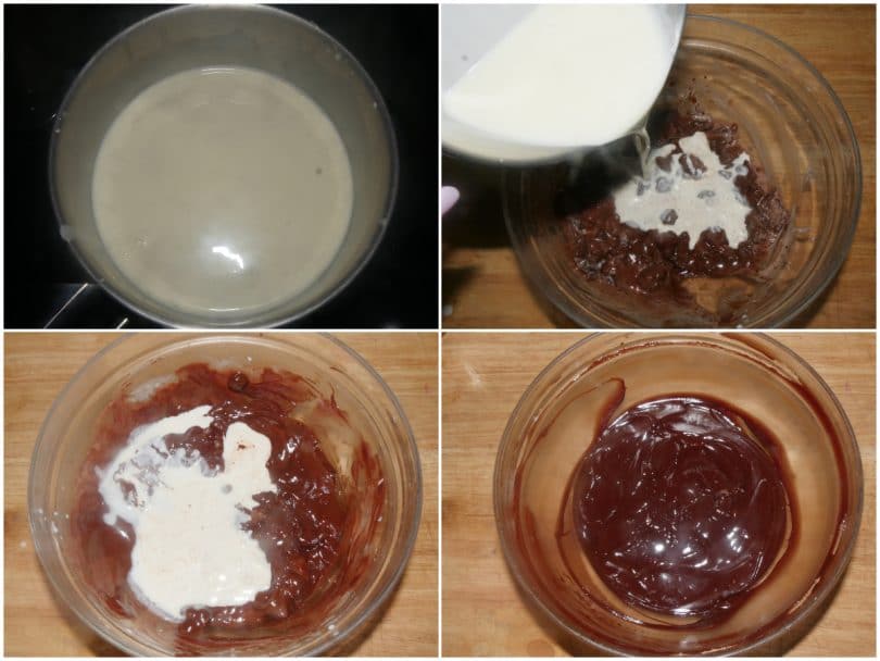 Scaldate la panna in un pentolino ed appena sarà arrivata al punto di ebollizione versarla sul cioccolato, quindi mescolate energicamente con un cucchiaio di legno fino a che il cioccolato non si sarà sciolto del tutto.Mettete ora la ganache ottenuta in una ciotola e lasciatela raffreddare mettendola immersa in un contenitore con acqua e ghiaccio, poi mettete in frigo per una decina di minuti.