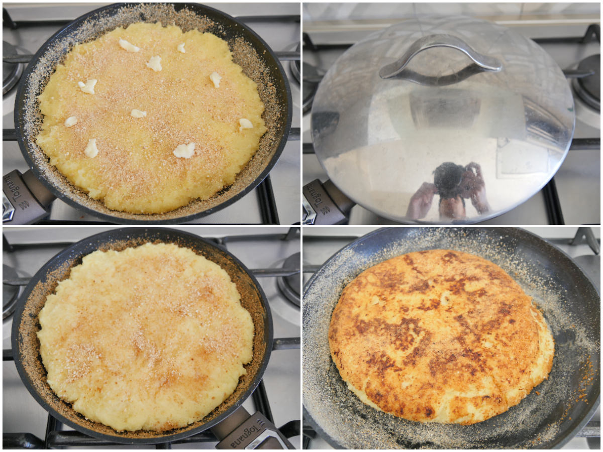 Imburrate una seconda padella e cospargete anche questa con il pangrattato, quindi, con un po' di cautela, staccate il gateau dalla prima padella e capovolgetelo nella seconda, in modo da finire la cottura, sempre con coperchio, per altri 5 minuti circa.