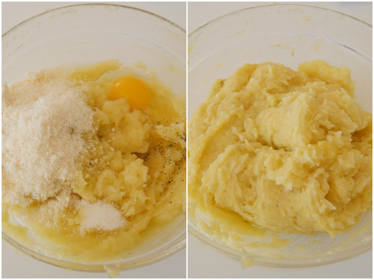 Unite alle patate schiacciate parmigiano, sale, pepe e uovo e amalgamate.