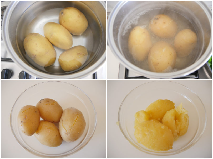 Innanzitutto bollite le patate per 35-40 minuti circa (fate la prova forchetta per testare se sono pronte), quindi pelatele e schiacciatele.
