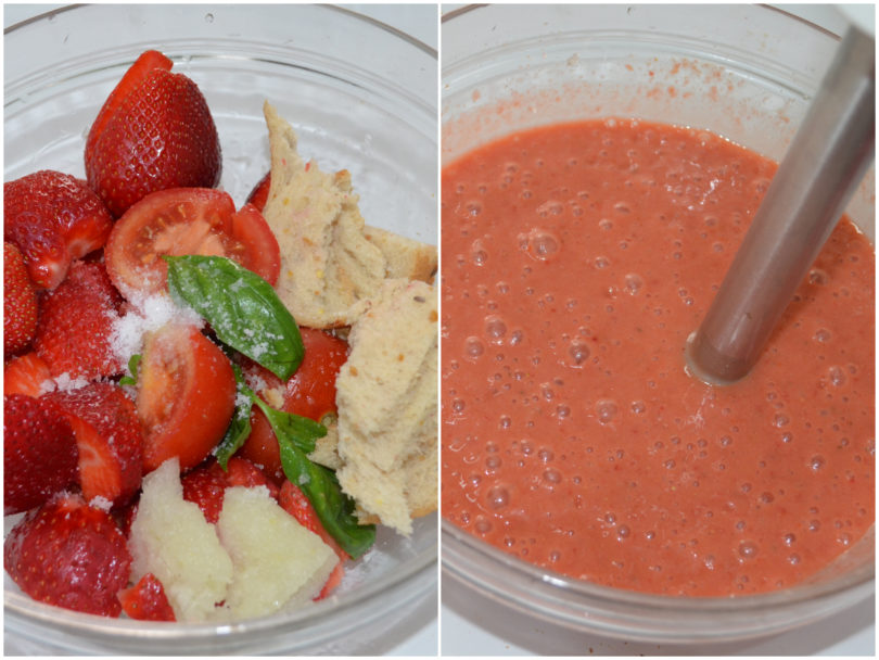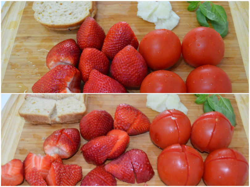 Lavate fragole e pomodori, pulite la cipolla, eliminate il picciolo delle fragole e tagliate tutto a pezzi, comprese le 2 fette di pancarrè.