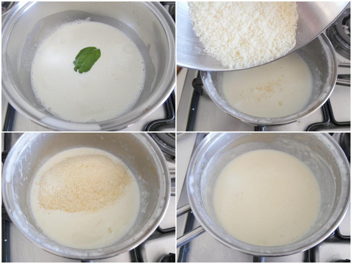 mettete la panna in un pentolino con il basilico e portate a bollore, quindi spegnete il fuoco, eliminate il basilico, aggiungete il formaggio e fatelo sciogliere per bene nella panna.