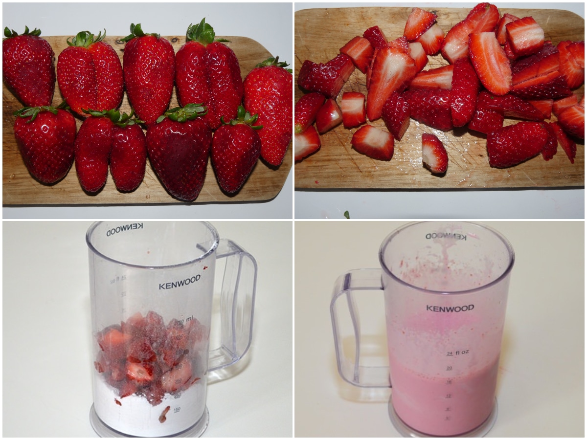 Lavate le fragole, eliminate loro il picciolo e frullatele insieme allo zucchero a velo vanigliato. Poi aggiungete il latte e la panna fredda di frigo.
