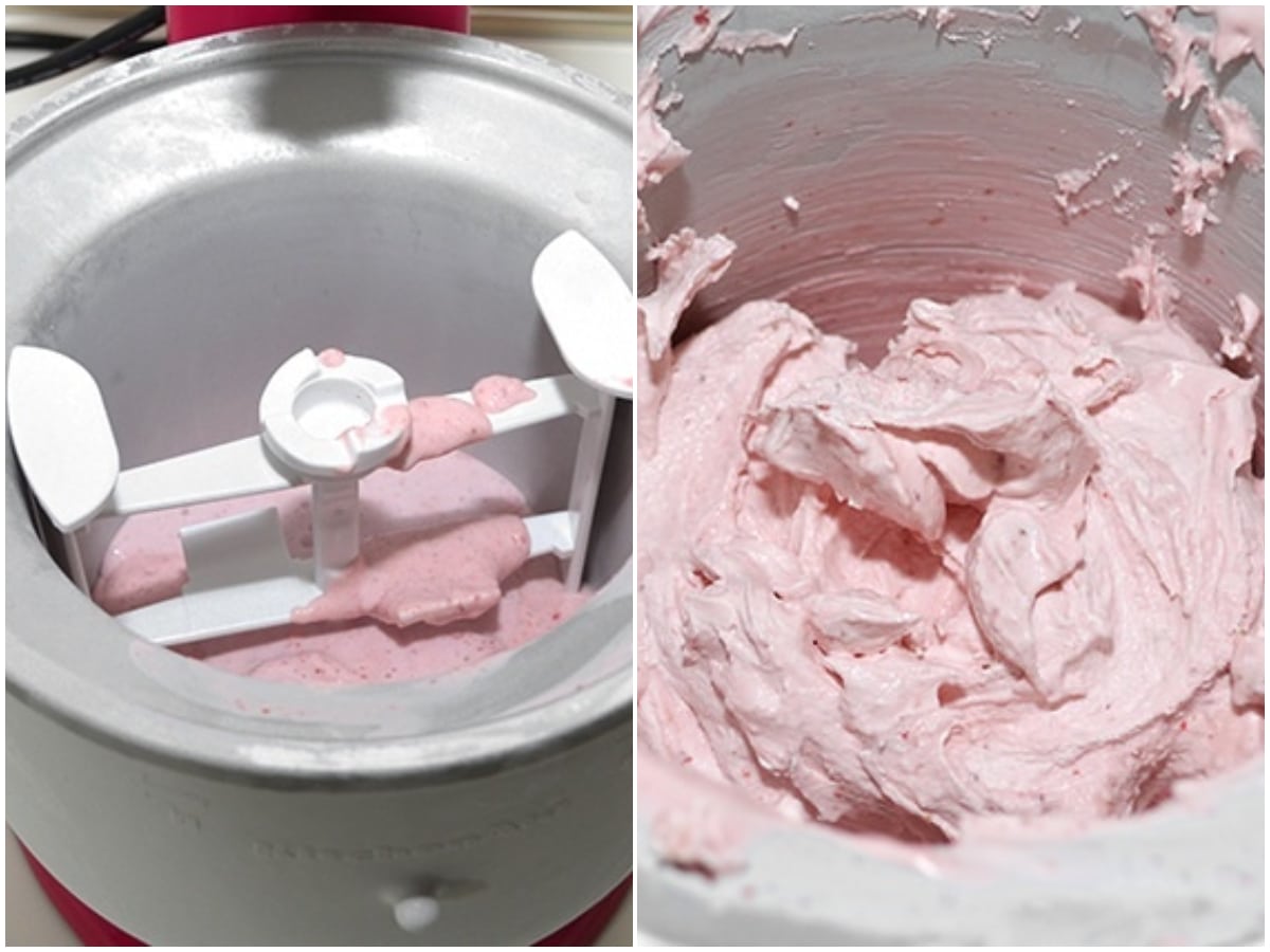 Quando il gelato alla fragola risulterà bello denso e cremoso, servite nelle coppette.