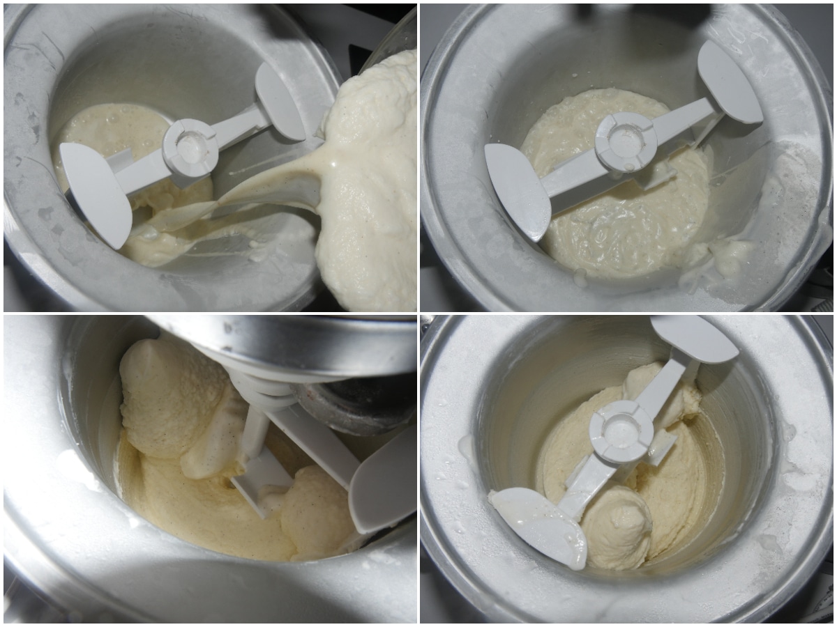Versate ora il composto ormai freddo ella vostra gelatiera ed impostatela come da manuale. Con la mia gelatiera ho impostato velocità 1 e ho mantecato per 30 minuti.