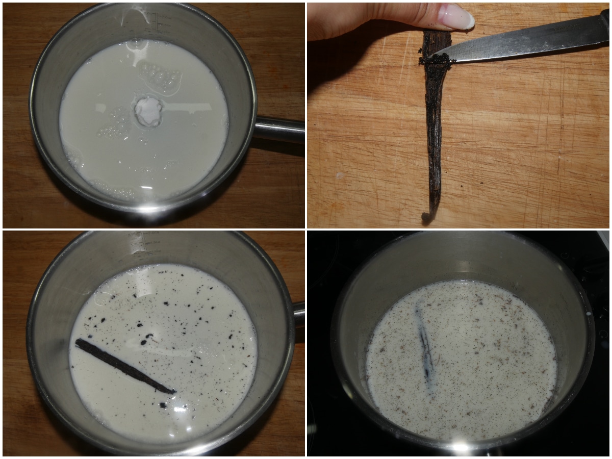 Fate bollire il latte con metà dello zucchero,il destrosio i semini dalla bacca di vaniglia e la farina di carrube.