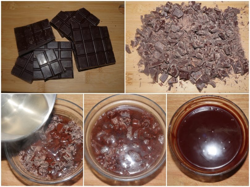 Tritate il cioccolato mettete in una ciotola e versare lo sciroppo di zucchero bollente e mescolate con un cucchiaio di legno.Battetelo per eliminare le bolle d'aria. (Se avete un termometro per dolci, dovrete arrivare ad una temperatura di circa 110°C.)