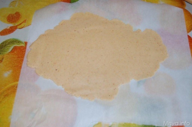 Dividere l'impasto in 2.Stendere ogni panetto tra due fogli di carta da forno fino ad ottenere una sfoglia di 4/5 mm.