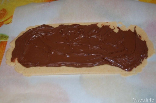 Ritagliare la sfoglia dando una forma rettangolare e spalmare il tutto con la nutella.