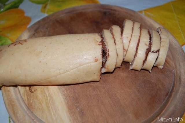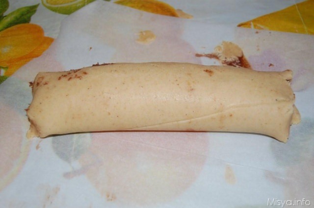 Rivestire i 2 rotoli ottenuti con la pellicola trasparente e riporre in frigorifero per un'ora.Riprendere quindi i rotoli e tagliarli a fette di circa 1 cm.