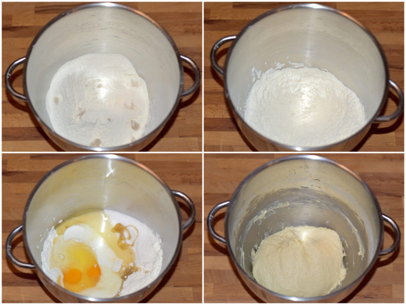 Iniziate dall'impasto: versate zucchero e farine in una ciotola, spezzettate il lievito e mescolate, poi incorporate kefir, uova, olio, sale e vaniglia e lavorate fino ad ottenere un panetto omogeneo.