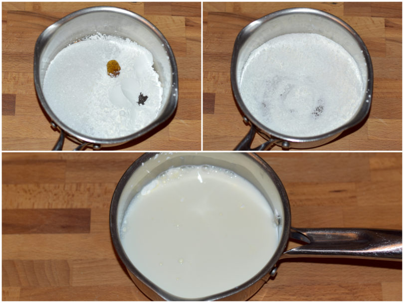 Mentre l'impasto lievita, occupatevi della crema: unite in un pentolino zucchero, vaniglia e maizena e mescolate, quindi incorporate il latte mescolando bene per non far creare grumi.