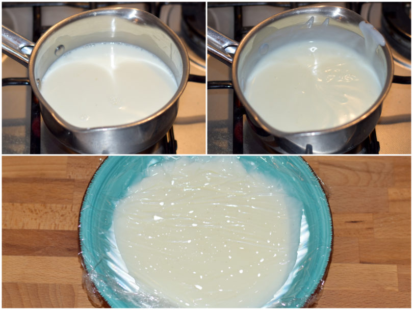 Trasferite sul fuoco e cuocete a fiamma bassa, continuando a mescolare costantemente, finché non si sarà addensata, quindi trasferitela in un contenitore basso e largo, coprite con pellicola a contatto e lasciate raffreddare completamente.