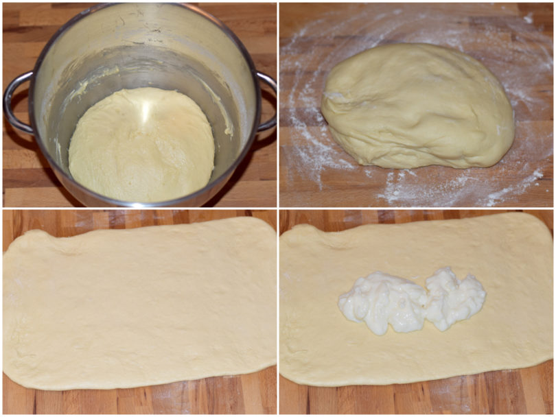 Riprendete l'impasto, sgonfiatelo con le mani e stendetelo sul piano di lavoro infarinato fino ad ottenere un rettangolo.