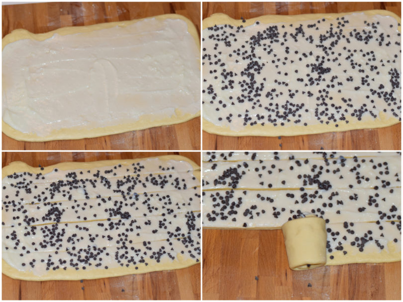 Spalmate la crema su tutta la superficie e distribuite uniformemente le gocce di cioccolato, quindi con una rotella tagliapizza o un coltello a lama liscia dividete per il lungo (quindi partendo dal lato corto) il rettangolo in 5-6 strisce.