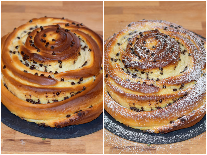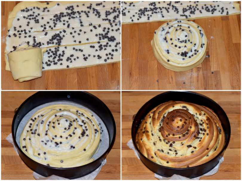 Trasferite la vostra girella gigante in uno stampo rivestito di carta forno e lasciate lievitare nuovamente per almeno 30 minuti in un posto caldo, poi cuocete per 45-50 minuti in forno statico preriscaldato a 180°C.