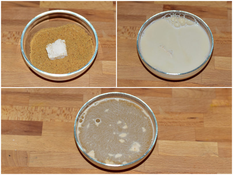 Unite in una ciotola zucchero, lievito e latte e mescolate fino a far sciogliere tutto.