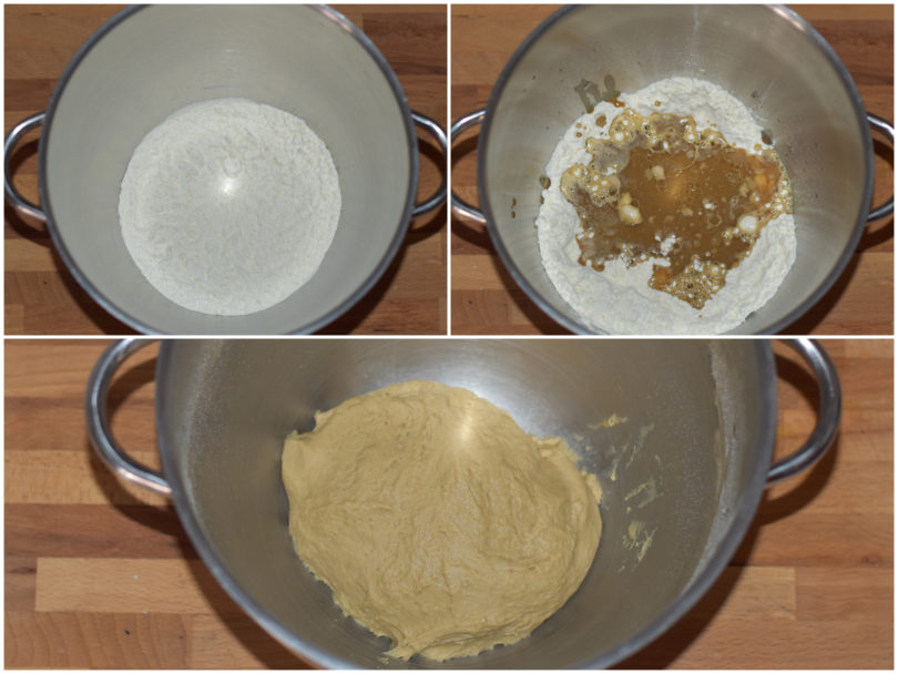 Mettete la farina in una ciotola, mescolatela con il sale, poi versate al centro il mix di latte e l'olio e lavorate fino ad ottenere un panetto liscio ed elastico, quindi coprite la ciotola con pellicola per alimenti e lasciate lievitare per circa 2 ore o fino al raddoppio del volume.0