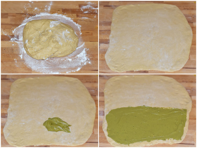 Riprendete l'impasto, sgonfiatelo con le mani, stendetelo in una sfoglia quadrata sul piano di lavoro leggermente infarinato e cospargetene metà prima con la crema di pistacchi e poi con la granella.