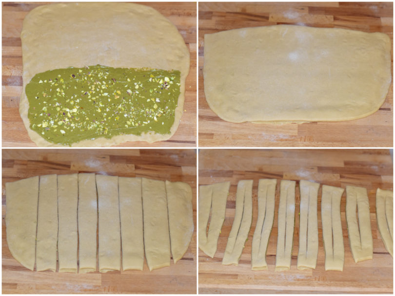 A questo punto richiudete la metà libera su quella farcita e dividete il rettangolo così creato in 8 strisce uguali, quindi incidetele al centro lasciando unite le estremità.