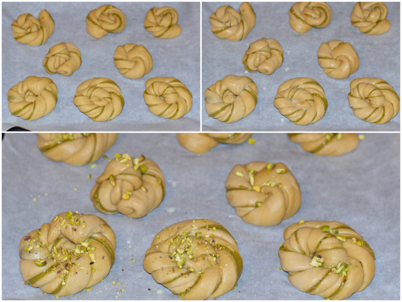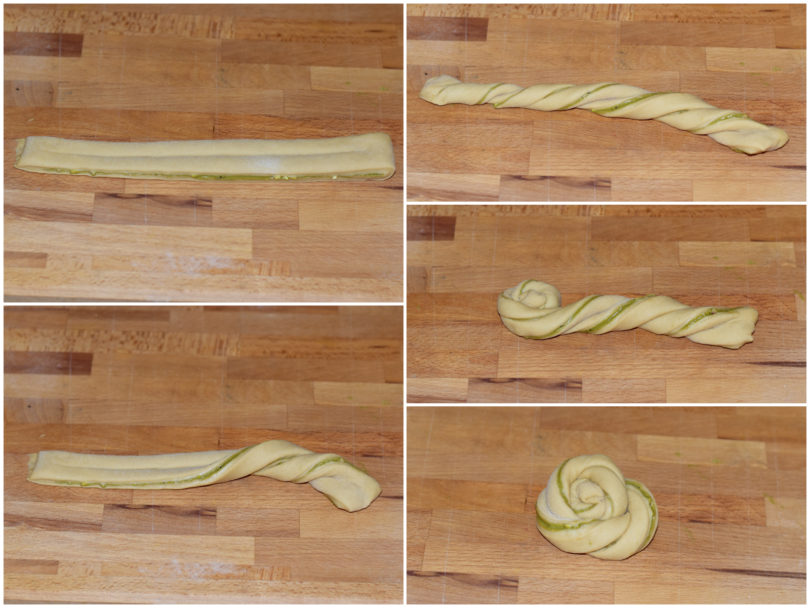 Procedete nel medesimo modo per creare tutte le girelle: man mano che le girelle sono pronte disponetele sulla teglia rivestita di carta forno, un po' separate tra loro, quindi lasciatele lievitare nuovamente per circa 30 minuti.