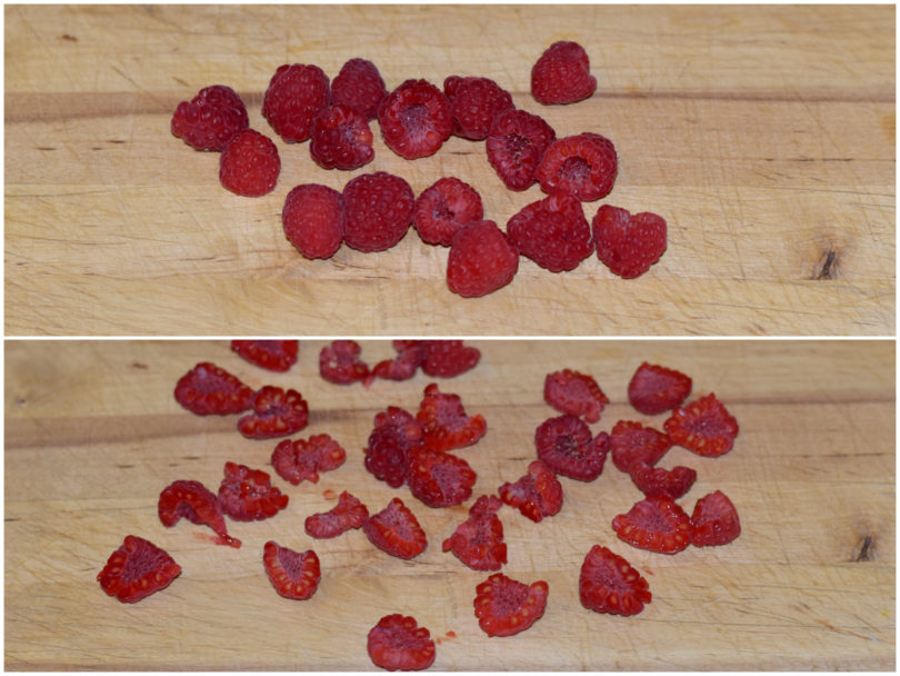 Decorate con i lamponi tagliati a metà, quindi cuocete per circa 30 minuti (o fino a leggera doratura) in forno statico preriscaldato a 175°C.