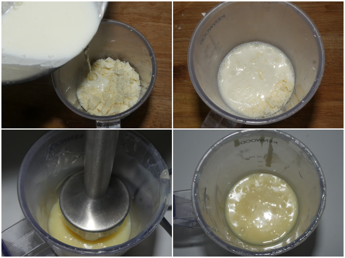 Trasferite il composto in un contenitore adatto al minipimer, insieme con il cioccolato tritato, e frullate con il minipimer.