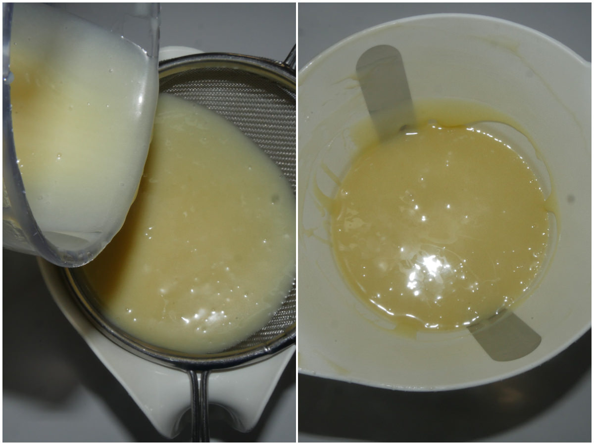 Filtrate la glassa con un colino a maglie strette in modo da eliminare eventuali grumi o pezzetti, coprite con pellicola per alimenti a contatto, lasciate intiepidire e poi trasferite in frigo finché non sarà completamente fredda.