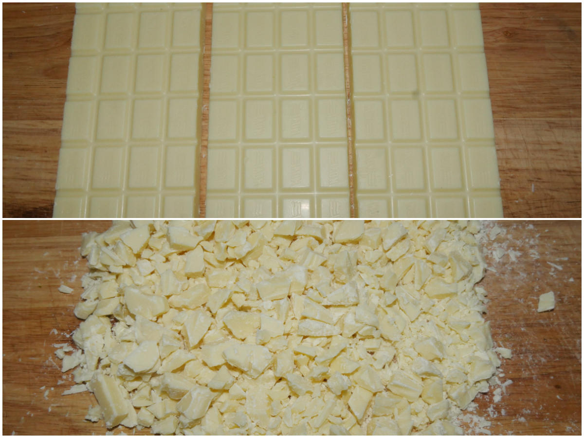 Innanzitutto mettete a bagno la colla di pesce in acqua fredda (deve restarci circa 10 minuti), quindi, a parte, tritate il cioccolato al coltello.