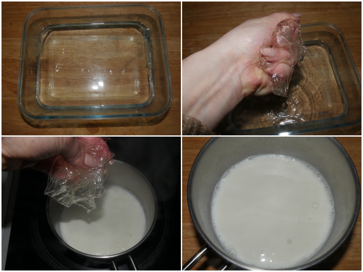 Versate panna e glucosio in un pentolino e iniziate a scaldarli, quindi aggiungete la colla di pesce dopo averla strizzata delicatamente, mescolando per farla sciogliere bene mentre portate la panna quasi a bollore.