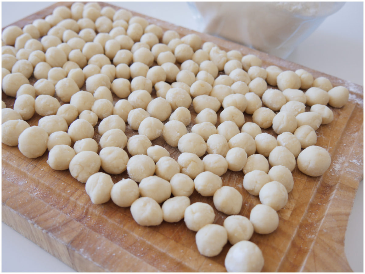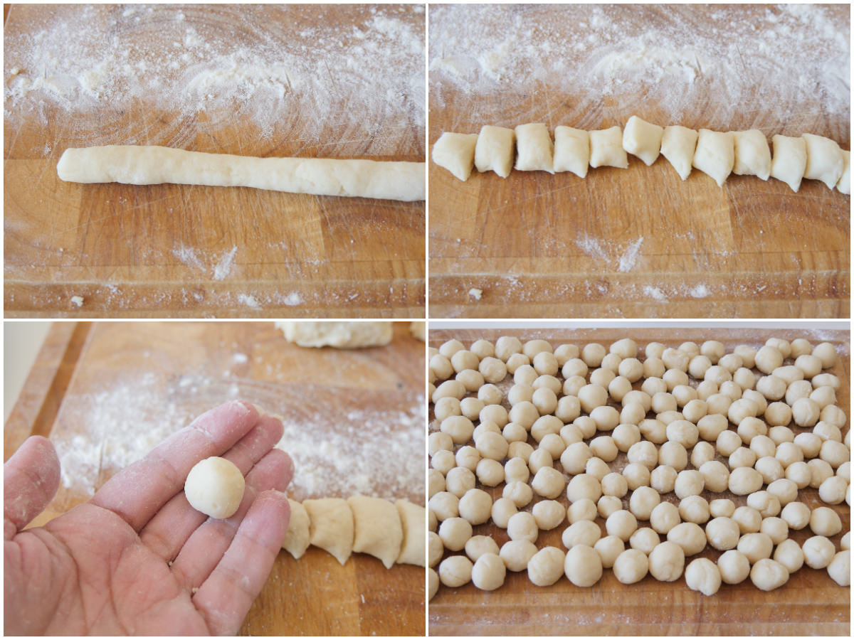 Una volta freddo, ricavate dei cilindretti dall'impasto e tagliateli a tocchetti, quindi ricavatene delle palline.