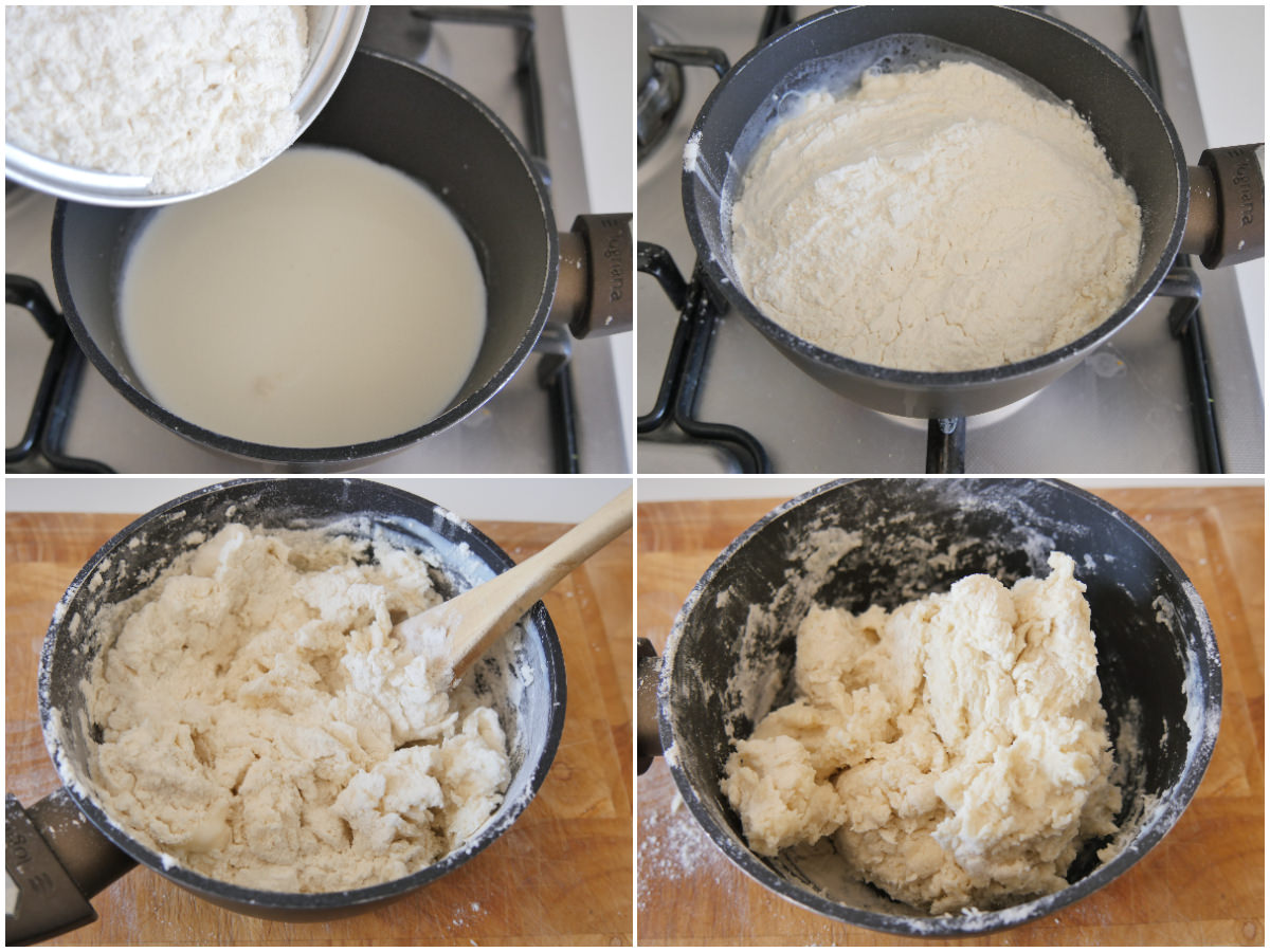 Versate il latte in una pentola, accendete il fuoco e fate scaldare: quando sarà quasi ad ebollizione, spostate dal fuoco, versate farina e sale tutti in una volta e mescolate con una cucchiaio di legno finché il composto non inizierà a staccarsi dalle pareti della pentola.