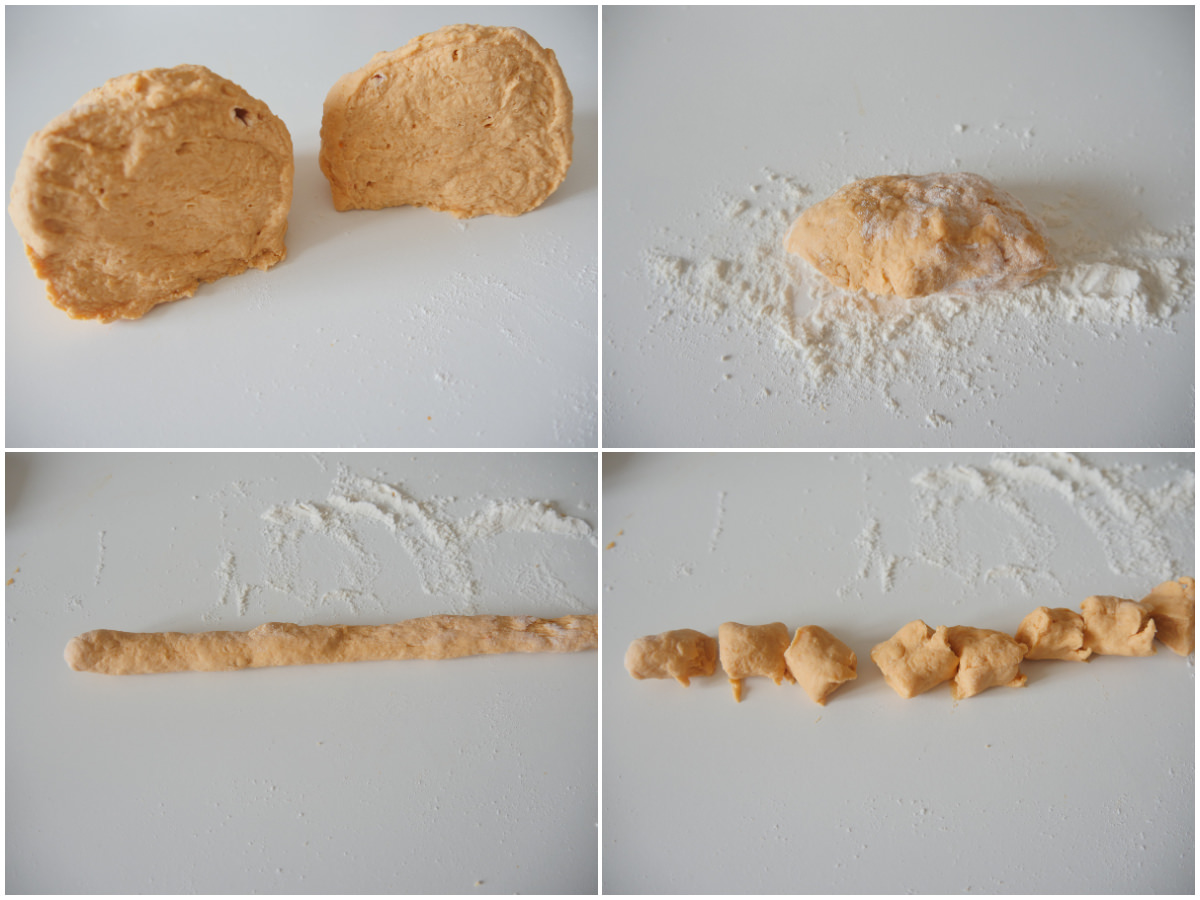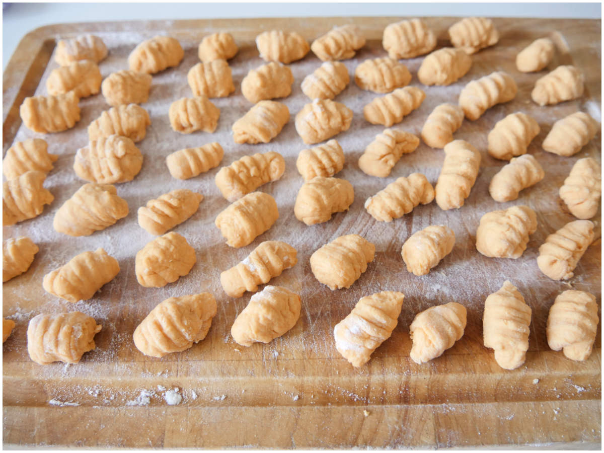 Finito il riposo, dividete l'impasto in più parti, formate dei lunghi cordoncini larghi circa 1,5 cm e tagliateli in gnocchi lunghi circa 2 cm.