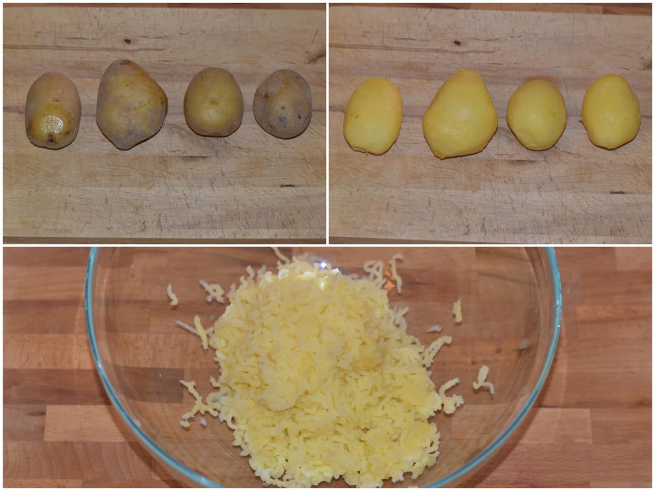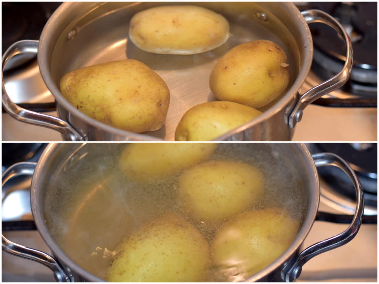Innanzitutto lavate bene le patate e lessatele per circa 35 minuti o finché non risulteranno ben cotte (i rebbi di una forchetta devono poter entrare e uscire facilmente).