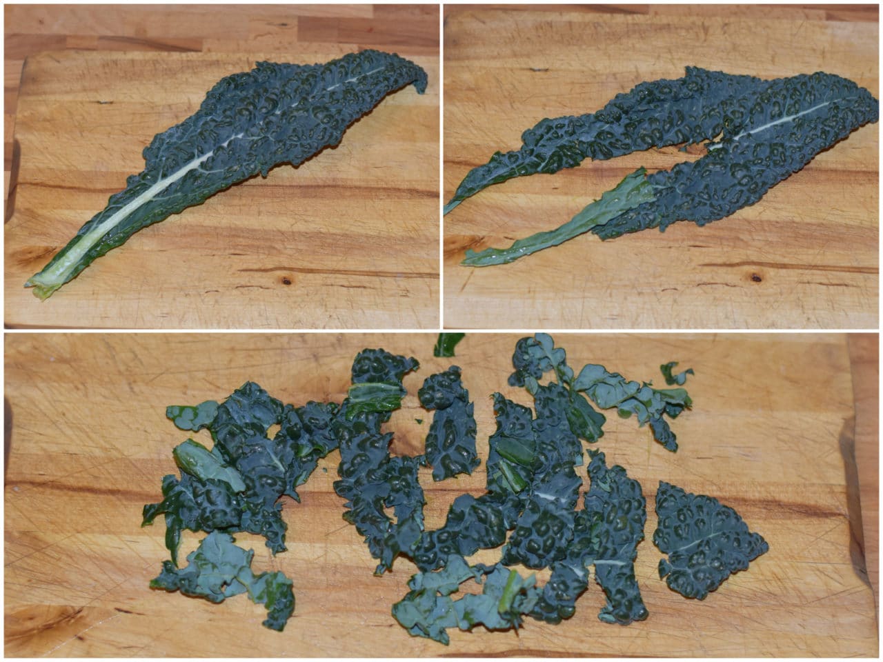 Nel frattempo, mondate il cavolo nero eliminando le coste interne delle fogie, poi tagliatelo a pezzi.