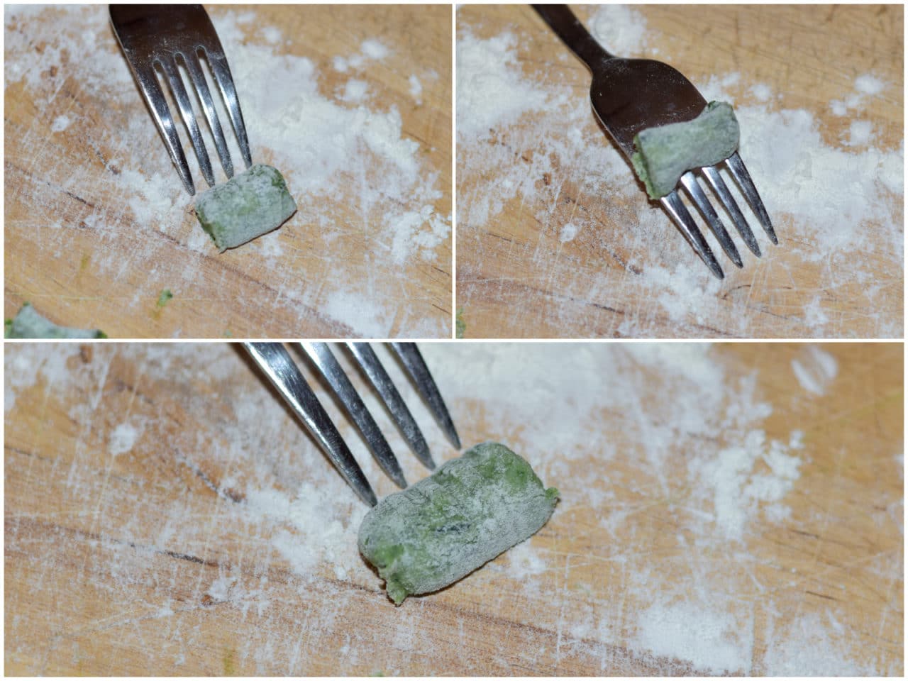 Passate gli gnocchi sui rebbi infarinati di una forchetta per ottenere il tipico aspetto rigato.