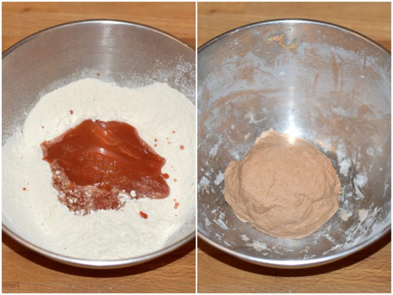 Unite in una ciotola farina, passata e un pizzico di sale e amalgamate fino ad ottenere un composto omogeneo, che lascerete riposare, coperto con un panno pulito, per almeno 10-15 minuti.