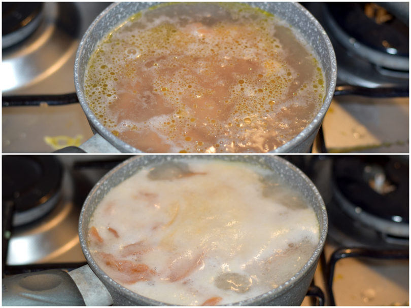Quando bolle, tagliate l'impasto con le forbici facendo cadere i pezzi direttamente nell'acqua.