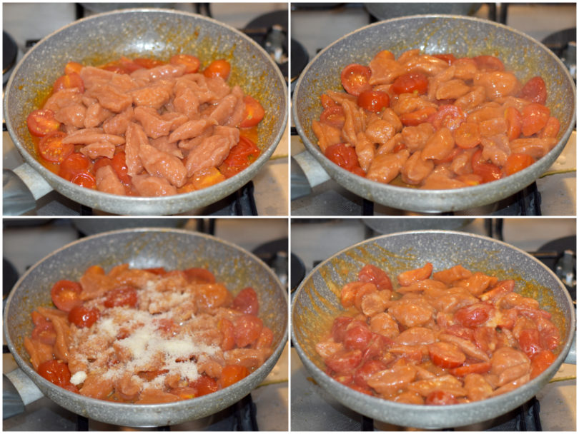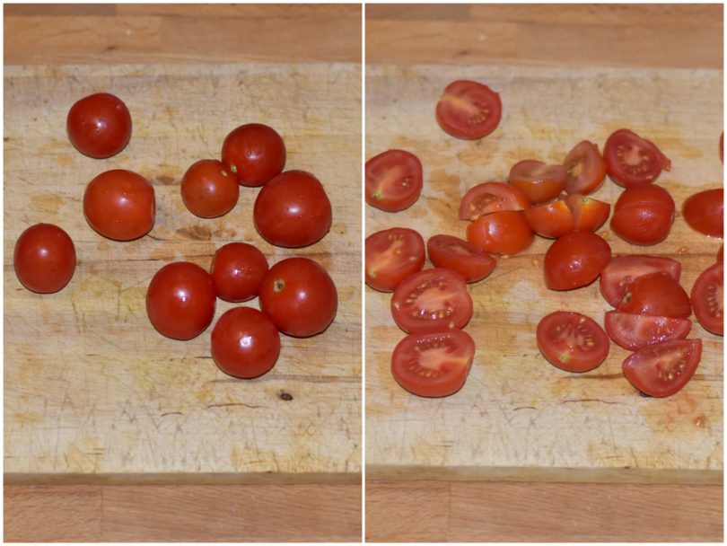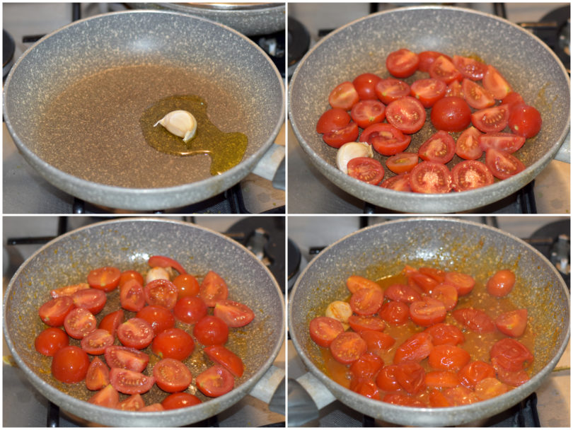 Intanto mondate i pomodorini, tagliateli a metà (o in più parti, se sono grandini), e preparate un sughetto fresco, cuocendoli in un'ampia padella con aglio, olio e sale per 5-10 minuti.