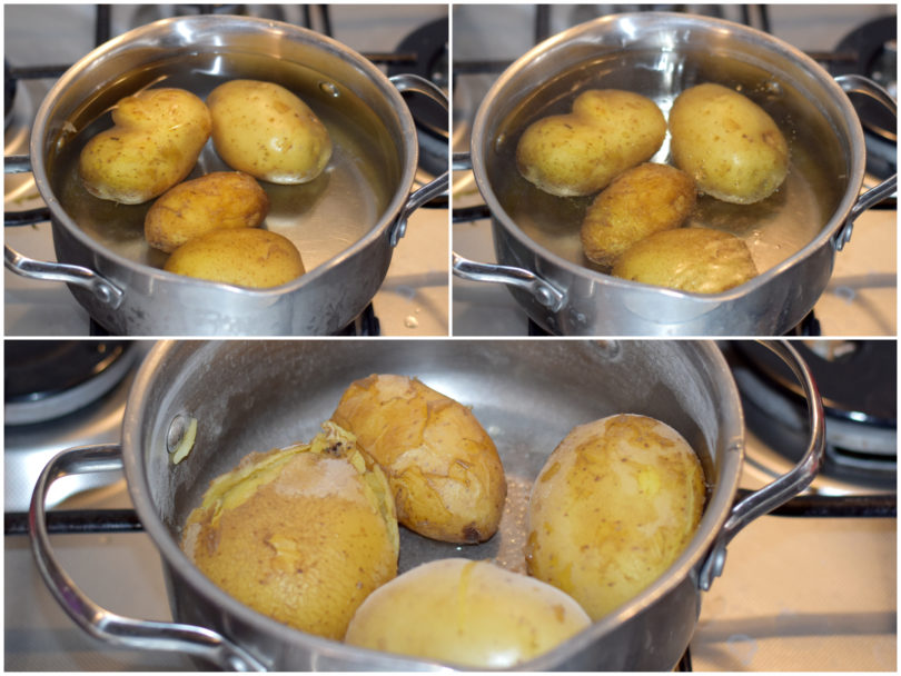 Lavate bene le patate, lessatele per circa 35 minuti, quindi scolatele, pelatele e schiacciatele con uno schiacciapatate o un passaverdure.