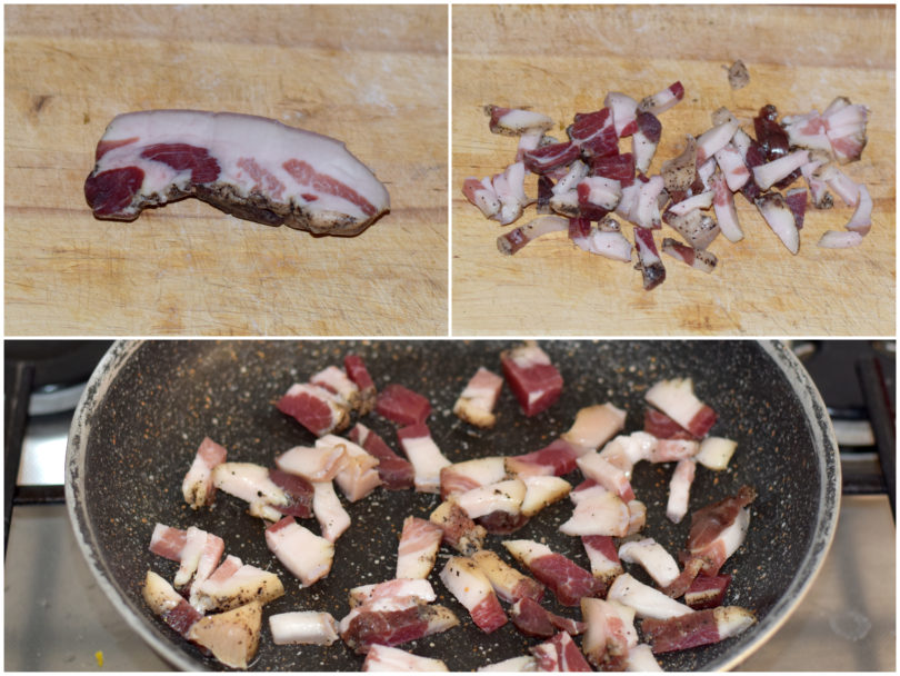 Tagliate il guanciale a striscioline e lasciatelo dorare a fiamma media in padella antiaderente senza aggiungere altro, dovrà diventare bello croccantino.